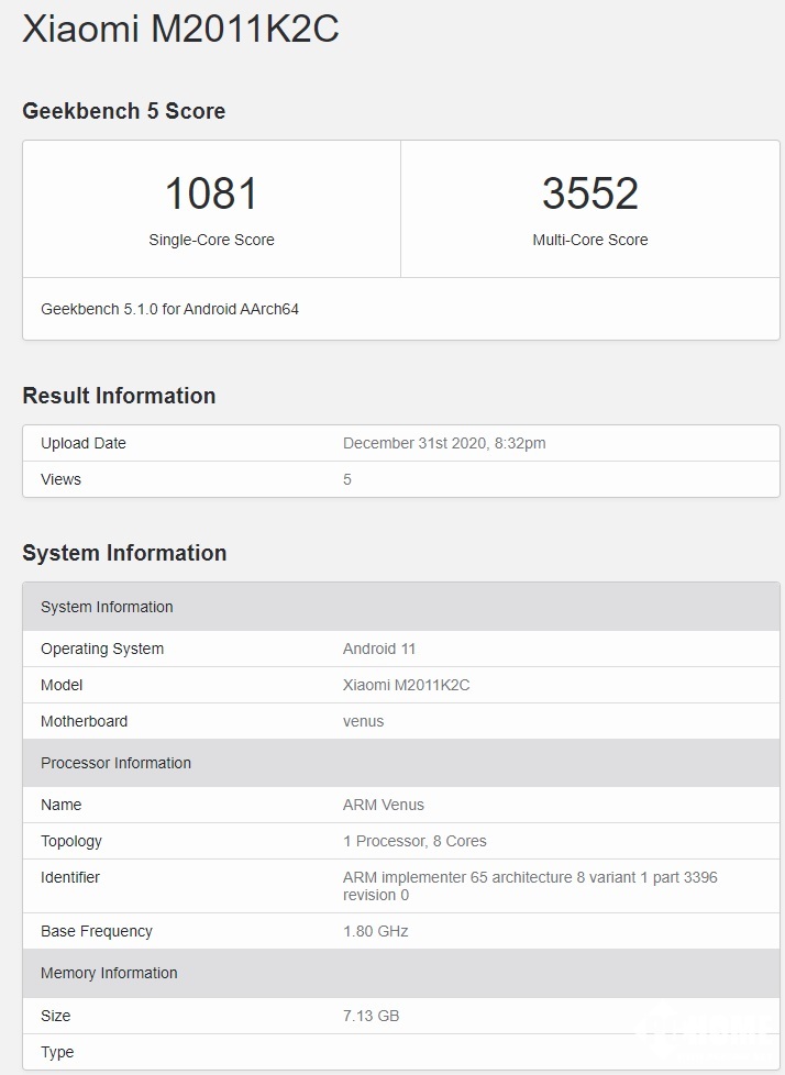 另外一款骁龙 888 机型小米 11 今日正式发售,目前最新一次的 Geekbench 5.1.0 结果为单核 1081,多核 3552 分。不过该结果与官方公布结果存在较大差异,此处仅作参考。