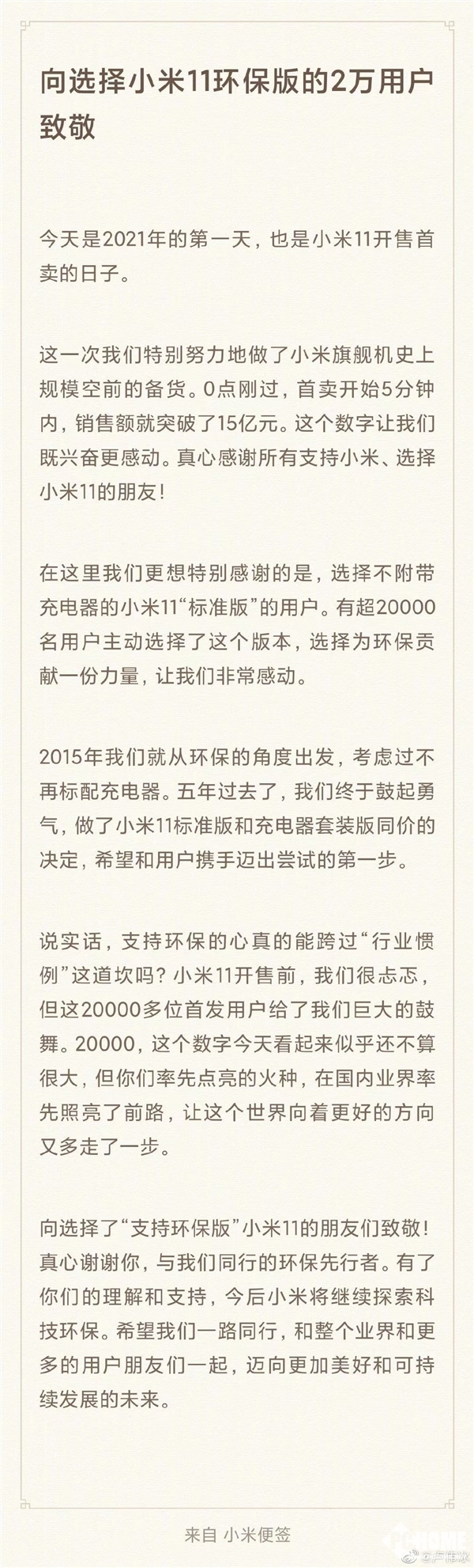 小米集团中国区总裁、Redmi品牌总经理卢伟冰发文表示,选择不附带充电器的小米11标准版用户有超过20000名用户选择,他们为环保贡献了一份力量,让我们非常感动。