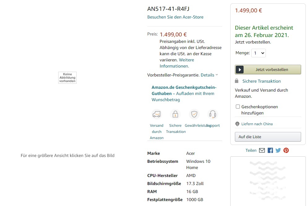 在德国亚马逊商城上架了一款宏碁新游戏本,该游戏本搭载R7 5800+RTX 3070显卡,售价1499欧元(约11900元人民币),将于2月26日发货。