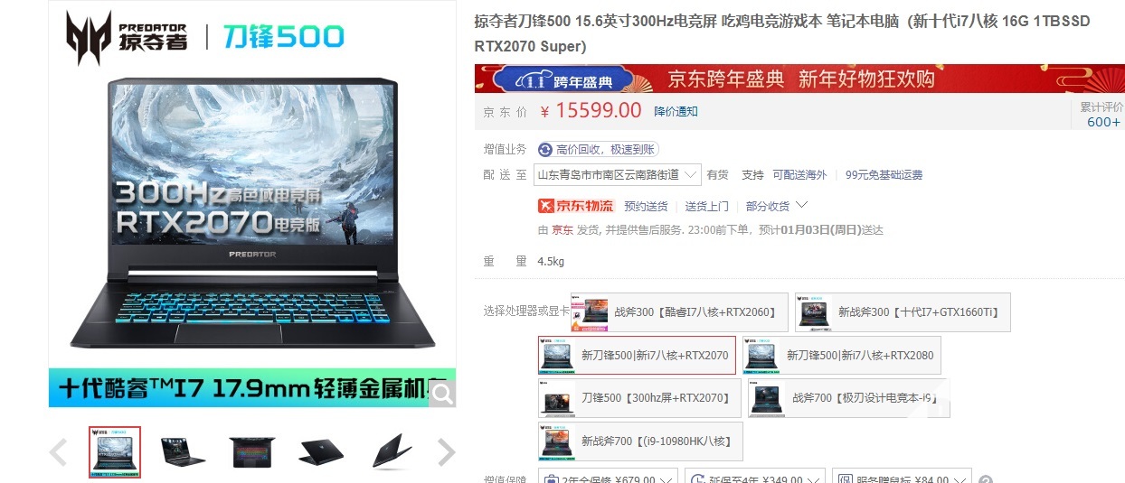 ▲在京东平台上,i7+RTX 2070 Super 的宏碁游戏本售价为 15599 元。