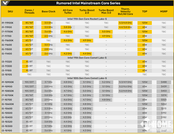 以下是VCZ总结的11代酷睿基本规格信息,i9-11900K从上一代的10核退回到8核,但据说全核能最高能摸到5.2GHz。
