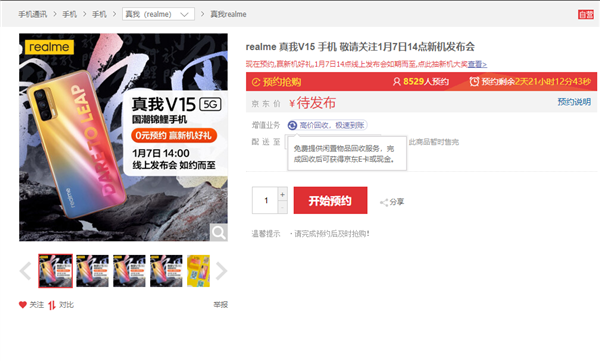 昨日,realme V15在京东开启预约,这款手机预订将于1月7日发布。