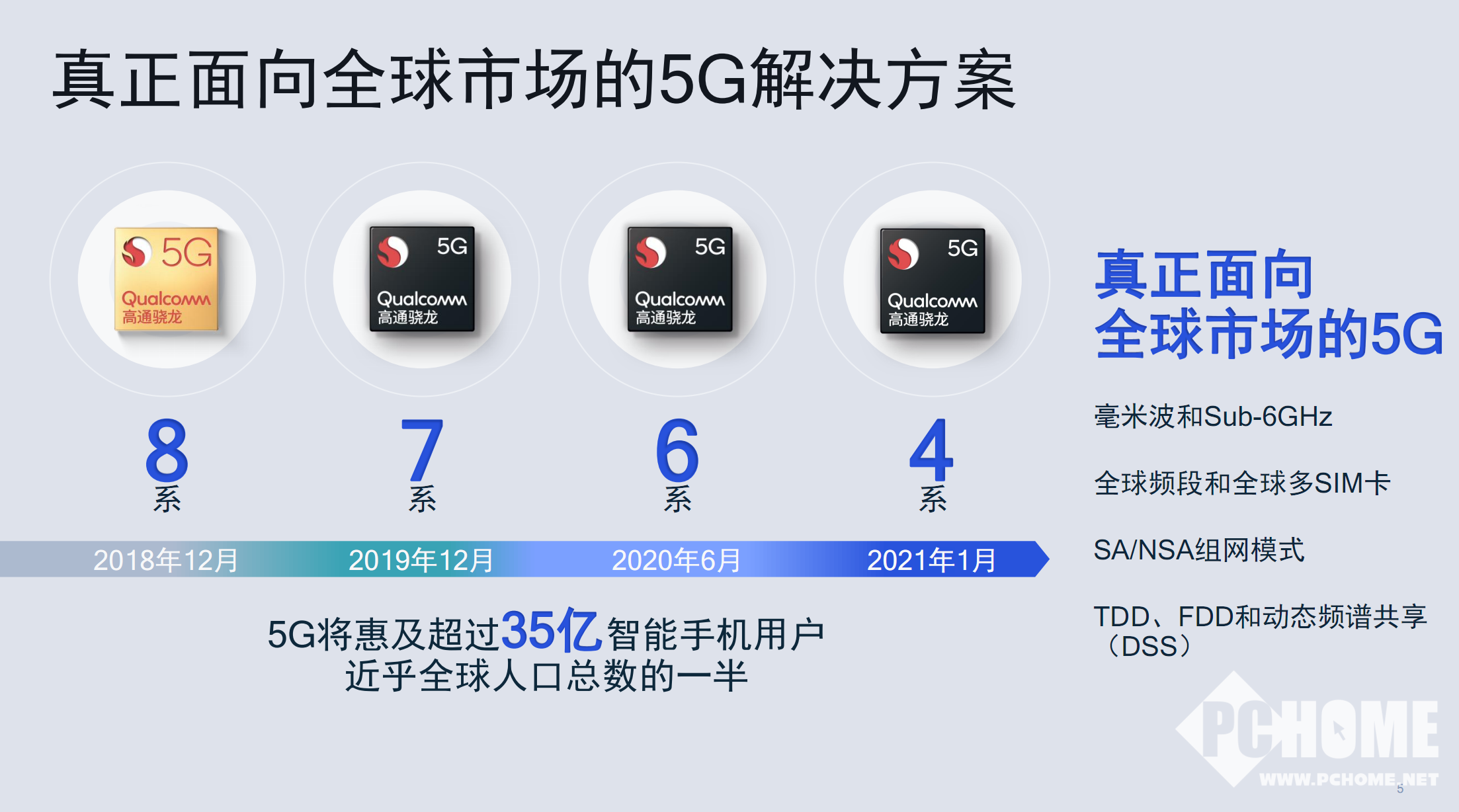 2018年12月的骁龙855、2019年的骁龙765/765G、2020年的骁龙690,先后在骁龙8系列、骁龙7系列、骁龙6系列中引入了5G,而现在,5G终于降临到骁龙4系列,同样是真正面向全球的5G,有望推动让5G触及全球35亿智能手机用户,占全球总人口的一半。