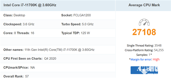 今日,i7-11700K在测试软件PassMark中现身,再次确认频率为3.6-5.0GHz,热设计功耗125W。目前的测试结果显示,i7-11700K的单核性能已经超过了锐龙7 5800X,综合性能比i7-10700K大涨了38%,实力非常强悍。