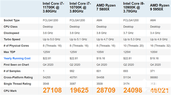 今天,i7-11700K又现身另一款测试软件PassMark,根据测试结果,i7-11700K的单核性能评分为3548,相比于i7-10700K提高了大约15%,已然超过3.8-4.7GHz的锐龙7 5800X、3.4-4.9GHz的锐龙9 5950X。