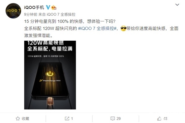 iQOO 7将全系标配120W超快闪充