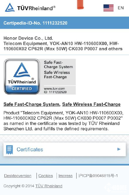 此外,证书还显示荣耀V40将支持最高50W的无线快充。