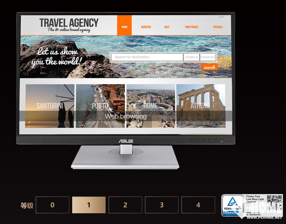 为了保护视力,此款显示器有着过滤蓝光功能,提供四种蓝光滤镜设置,并通过了德国莱茵认证;同时不闪屏技术可以避免有害频闪,提高观看舒适度。