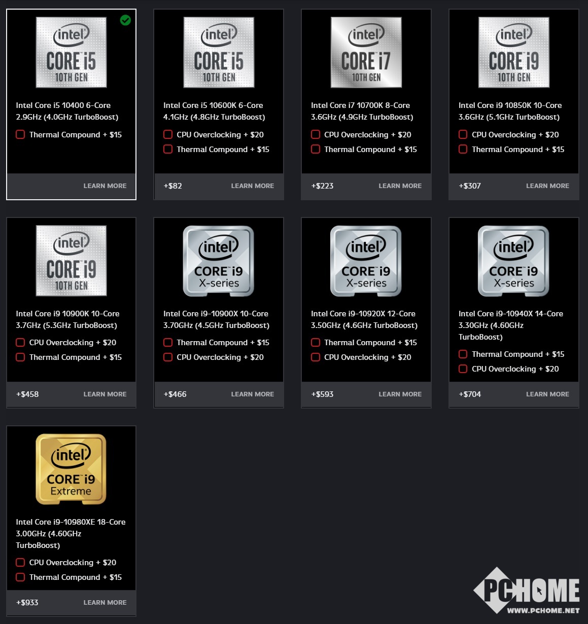 Origin RestoMod 定制主机有着丰富的配置可选,用户可以在官网定制 CPU、主板、内存、硬盘等几乎全部硬件。CPU 方面,最低配可选英特尔 i5 10400 处理器,最高可选配 AMD 线程撕裂者 3970X。支持超频的 CPU 如果想要厂家帮你设置,需要加价 20 美元,CPU 采用强化版导热硅脂也要额外花费 15 美元。