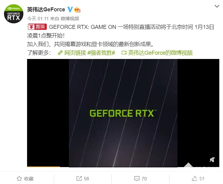 1月6日,英伟达官方微博的最新消息显示,GEFORCE RTX: GAME ON 特别直播活动将于北京时间 1 月 13 日凌晨 1 点整开始,将会揭秘其在领域内的最新成果,预计将会发布 RTX 30 系列笔记本显卡。