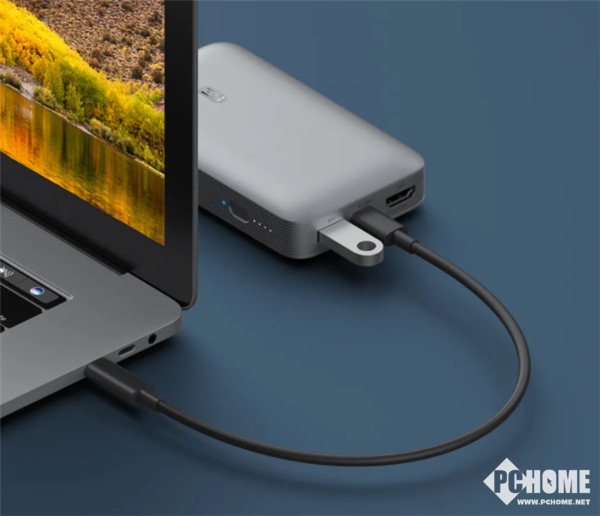 实现HUB模式需搭配包装内USB-C数据线(USB 3.2 Gen1x1),理论传输速率可达5Gbp。