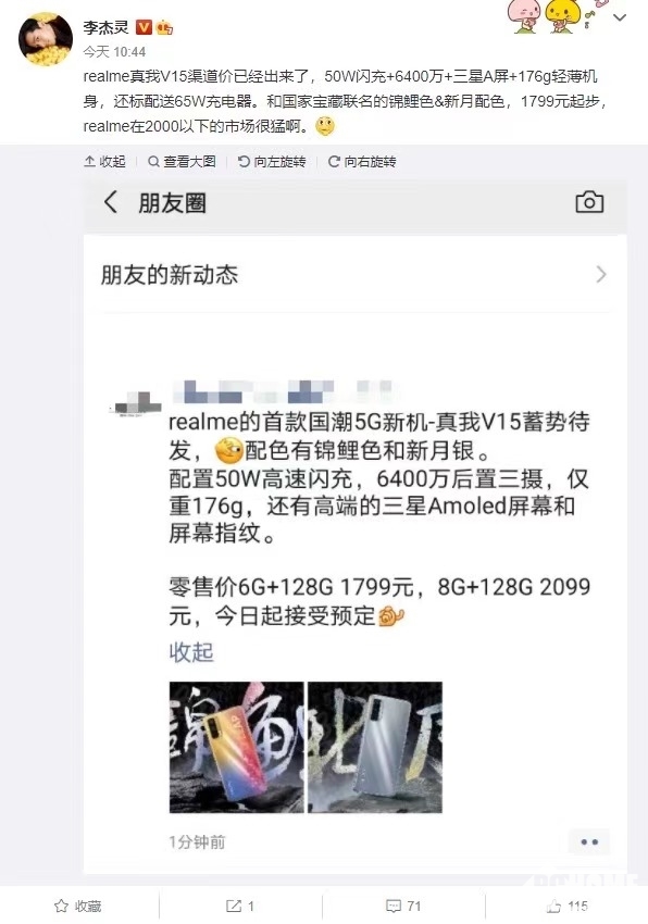 目前官方还未正式公布realme V15的配置信息,但是近日爆料显示其将采用AMOLED挖孔显示屏,支持屏下指纹识别,核心搭载联发科天玑800U,支持55W快充(标配65W充电头),背部配备了三摄相机模组,主摄为6400万像素,整机重量为176g。