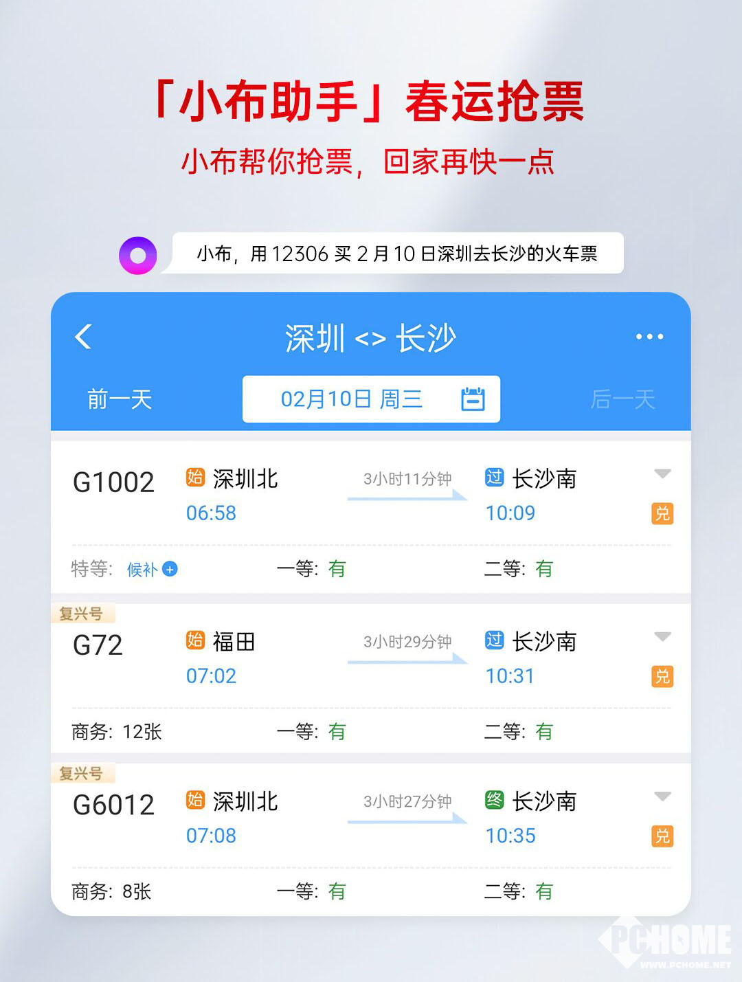我们在抢票时即可使用小布助手进行操作,只需要说出乘车时间和出发地和目的地,小布助手即可直接为我们列出当日所有符合的车次,方便我们查看相应车次并抢票。当然,我们也可以直接使用更具体的车次信息语音指令,让抢票变得更为简便。