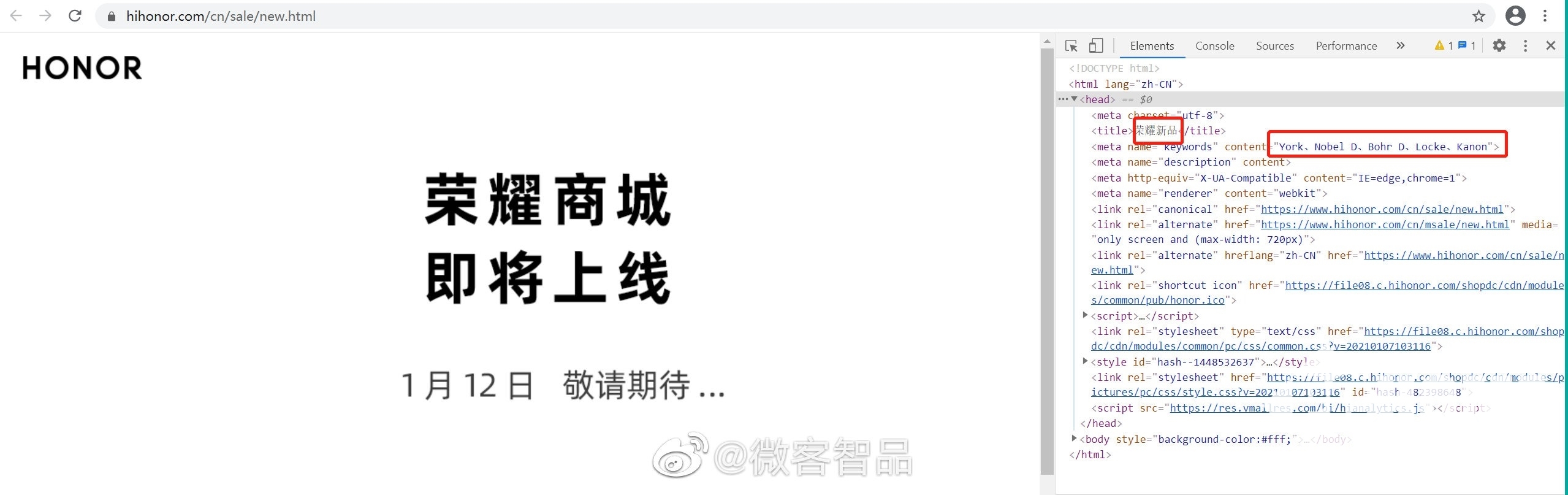荣耀官方宣布将会在1月12日推出荣耀商城,提供荣耀品牌相关的购物和服务。今天,有网友称在荣耀商城的网页源码中发现了荣耀新品的信息。