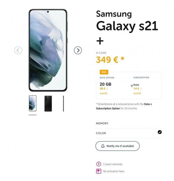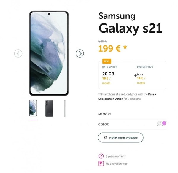 根据页面信息来看,128GB版本的Galaxy S21合约起售价为849欧元(约合人民币6800元),而Galaxy S21+的起售价为1049欧元(约合人民币8400元),作为顶配的Galaxy S21 Ultra起售价为1399欧元(约合人民币11100元)。