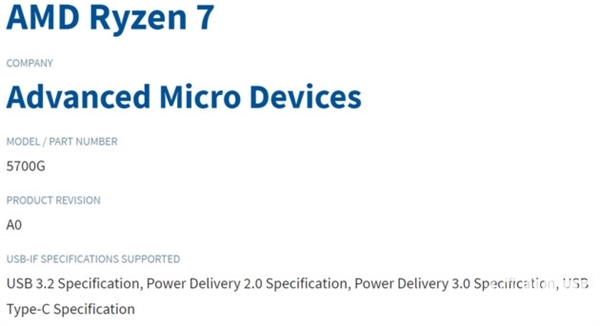 在USB-IF组织中,AMD又有一款新处理器通过认证,名字叫做锐龙7 5700G,显然也是Cezanne家族的一名成员,基于AM4插槽,最多8核、TDP 65W,核显还是Vega架构的。