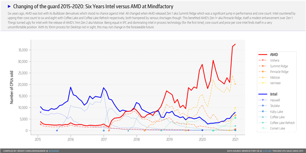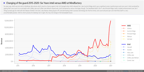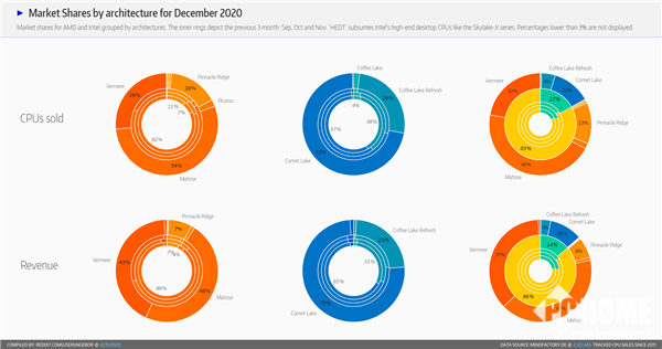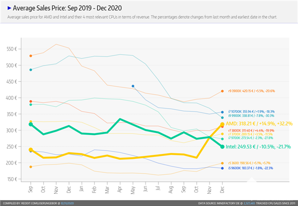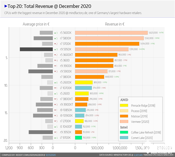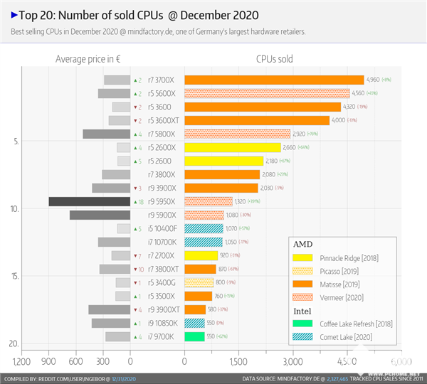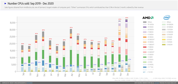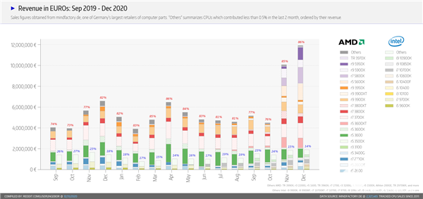 德国的最大电商MindFactory每个月都会公布处理器、显卡销量统计,现在公布了2020年12月份的数据,其中AMD锐龙和英特尔酷睿的对比数据尤其有趣。