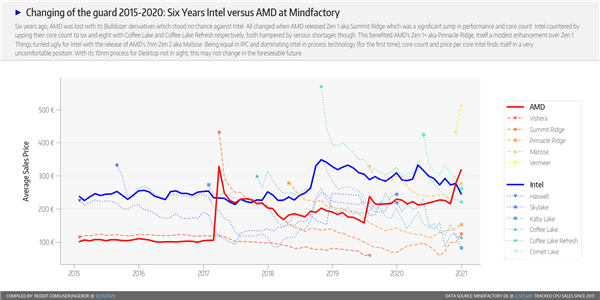 也就是说,AMD锐龙的均价已经比Intel酷睿高出多达28%,性价比完全易位。这自然主要是因为锐龙5000系列价格走高,而且目前只有高端型号,Intel则在性能不占优的情况下大打价格战。