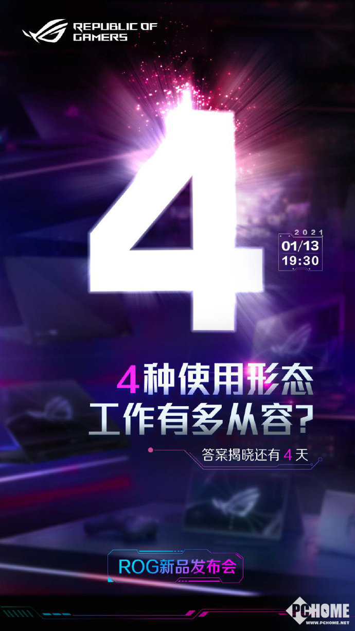 ROG 在海报中表示这款产品将会有 4 种使用形态,而海报中可以隐隐看到一个 “帐篷模式” 的 “败家之眼” 游戏本,一旁还有游戏手柄。