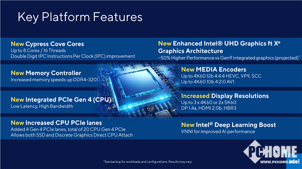 CPU架构方面,升级为全新的“Cypress Cove”,IPC(每时钟周期指令数)将会提升两位数,也就是超过10%,最多8核心16线程,桌面首次引入Xe GPU架构,支持DDR4-3200内存、PCIe 4.0总线、USB 3.2 Gen.2x2 20Gbps接口、DLBoost深度学习指令集。