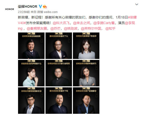 苏芒、秦朔、李现、知乎创始人周源、新浪微博CEO王高飞、英特尔市场营销集团副总裁王稚聪、哔哩哔哩副董事长兼COO李旎、科大讯飞创始人胡郁、58同城CEO姚劲波9位全行业领袖级人物,以及中新经纬、凤凰科技、环球网、中国经济网等国内顶部媒体,此次参与联动事件的阵容堪称互联网顶级。此外,还有荣耀全渠道合作伙伴纷纷送来祝福。