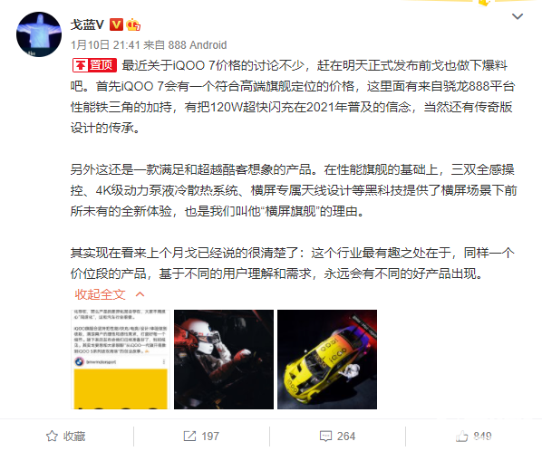 iQOO新一代旗舰产品iQOO 7系列将于今天晚上19点30分正式亮相,早前官方已经公布了新机的大部分配置情况。而日前,最受用户关注的售价问题,也被iQOO的产品经理@戈蓝V在微博发文时候暗示了一波,他表示,iQOO 7会有一个符合高端旗舰定位的价格。