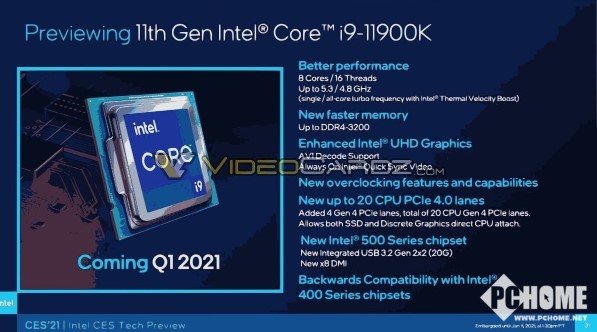 据外媒 videocardz 报道的最新消息,英特尔已在 CES 2021 上正式发布了其第 11 代 Core Rocket Lake-S 系列处理器。还发布了一张 i9-11900K 的幻灯片, CPU 拥有 8 核 16 线程,对标锐龙 9 5900 X,英特尔官方暂未透露具体售价和开售日期,将在今年第一季度正式发售。