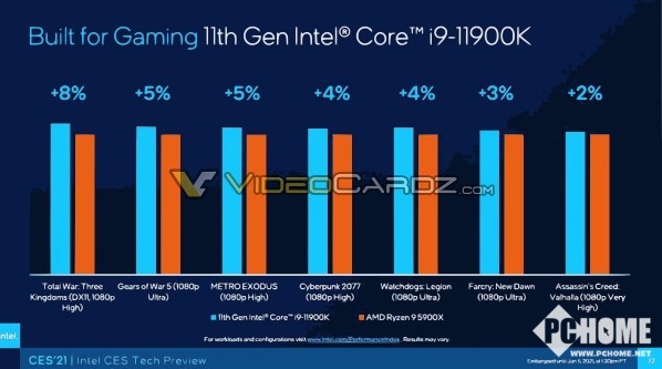 在发布会中,英特尔针对 AMD Ryzen 9 5900X 12 核 CPU 演示了其新的 Rocket Lake-S Core i9-11900K。根据外媒 Geeknetic 发布的截图,在游戏基准测试中,同样使用 1080p 画质,在其他配置几乎相同的情况下,英特尔 Core i9-11900K 比 Ryzen 9 5900X 略胜一筹。