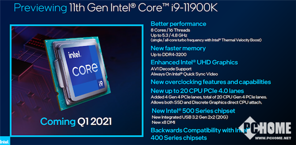 在CES 2021期间,Intel更新了多款消费级产品,11代酷睿Rocket Lake桌面处理器也公布了,确定一季度上市。酷睿i9-11900K的IPC提升19%,GPU性能增超50%,Intel公布了的芯片组有Z590、B560和H510。