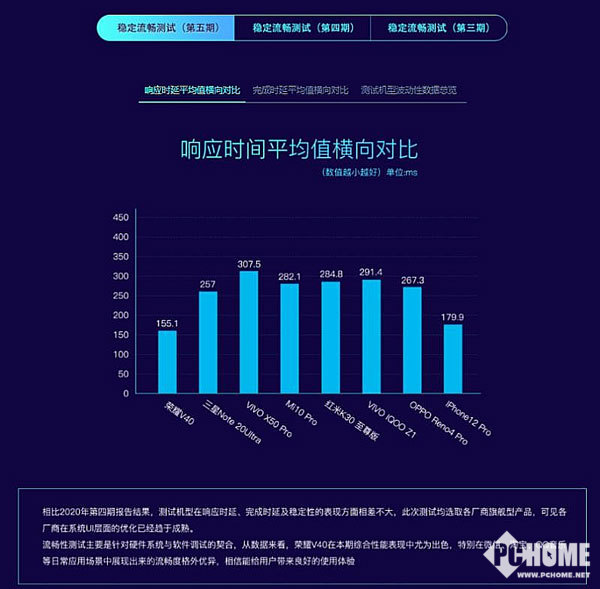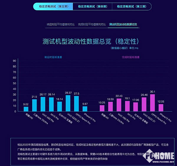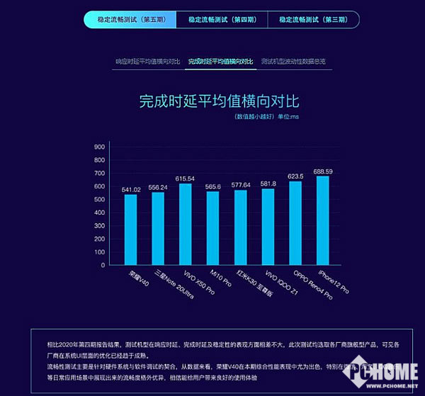 荣耀V40凭借快速的响应、稳定的性能,以及持久的抗老化能力,力压三星Note20 Ultra、小米10 Pro、iPhone 12 Pro等多款高端旗舰,成为鲁大师手机流畅度测评报告的MVP选手。