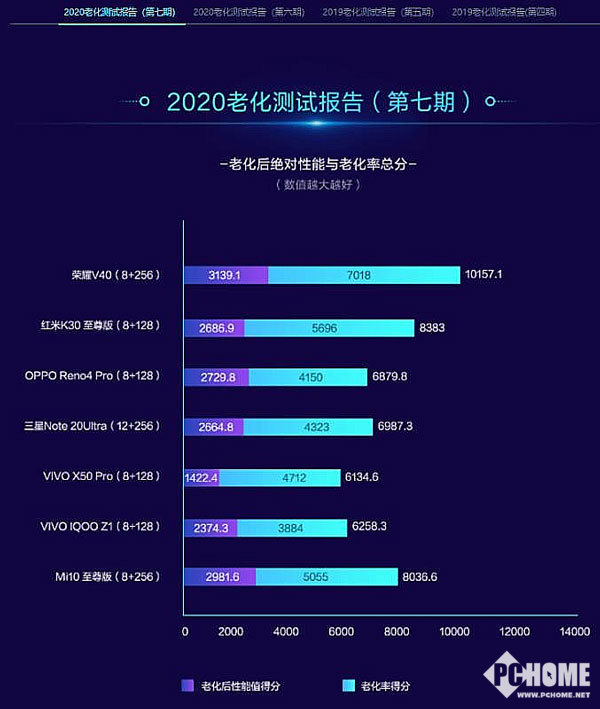 通过测试报告可以看到,荣耀V40在老化后绝对性能与老化率测试中,斩获了10157.1的最高得分,测试项目老化率仅为3.42%,远远高于小米10至尊版、三星Note20 Ultra等旗舰机型。