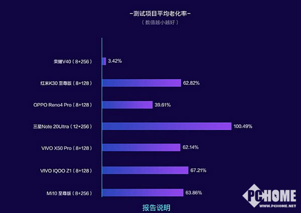 并且,在测试项目平均老化率方面,荣耀V40仅为3.42%,同样远低于三星Note 20Ultra的100.49%,以及小米10至尊版的63.86%。荣耀V40出色的抗老化表现,意味着用户将不再需要为长久使用导致卡顿而感到担心。