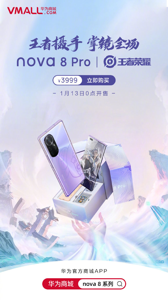 今天,华为商城正式官宣,网友们期待已久的华为与《王者荣耀》联名推出的nova 8 Pro“鲁班8号”定制款将会在1月13日零点开启首销,售价3999元。