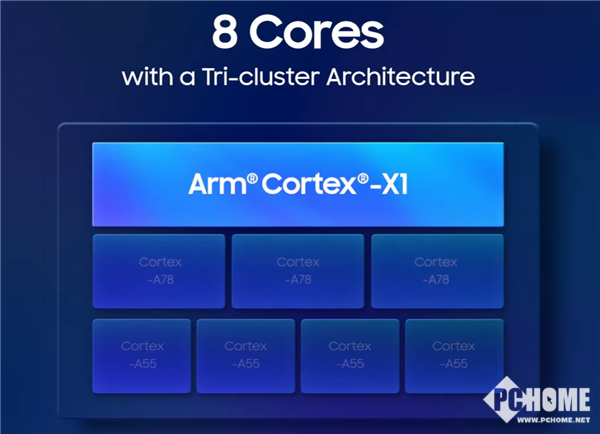 CPU方面,Exynos 2100集成了8核CPU,由1个2.9GHz的ARM Cortex-X1超大核、3个2.8GHz的A78及4个2.2GHz的A55小核心组成,其中X1的频率比高通骁龙888的2.84GHz还要高一些。