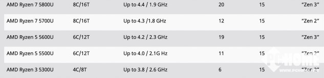 AMD 锐龙 5000U 系列移动处理器参数一览: