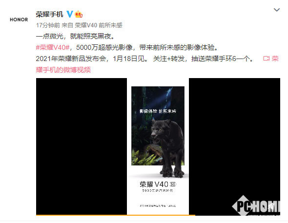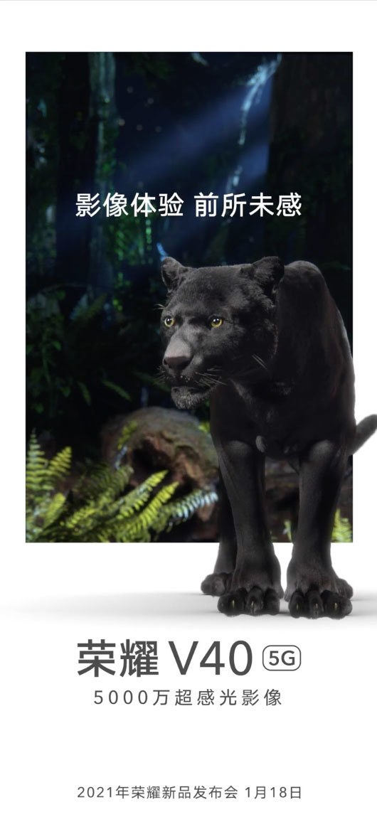 【PChome手机频道资讯报道】1月14日,荣耀官方继续通过微博短片的形式,为即将于1月18日发布的荣耀V40进行预热。短片中一只黑豹从暗处走来,伴随一丝微光照进,黑豹及漆黑的环境被瞬间点亮,暗喻荣耀V40将拥有出众的暗拍能力。而博文中“5000万超感光影像”则直白透露,荣耀V40将加持5000万超感光影像系统,为用户带来前所未感的影像体验。