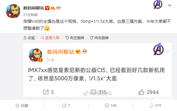 根据知名爆料博主@数码闲聊站透露的消息显示,荣耀V40将采用三摄配置,其中主摄的为1/1.5x大底的索尼IMX7xx。