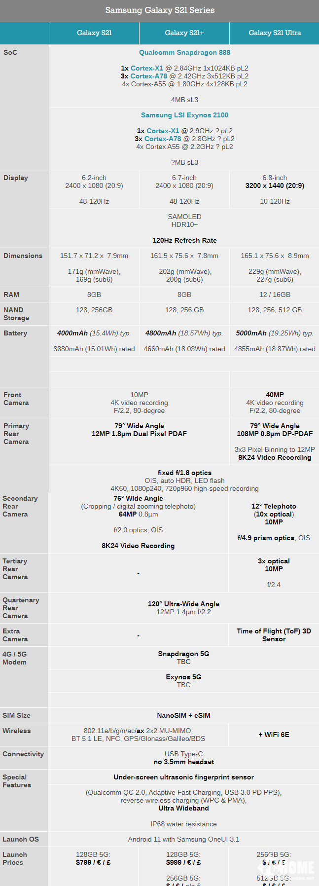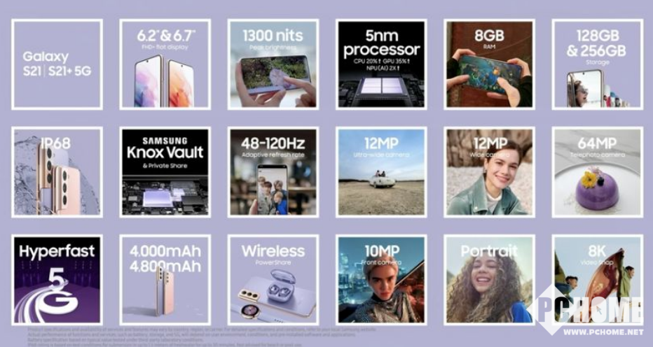 处理器方面,三款Galaxy S21系列依然是双处理器可选,配备了骁龙888或者Exynos 2100处理器,二者都是5nm工艺,CPU都有1个X1超大核,集成全网通5G等,性能水平相当接近。