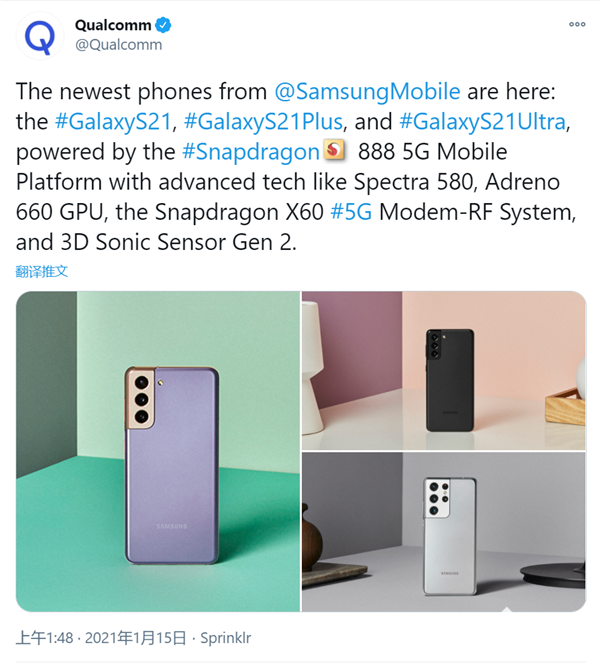 除此之外,三星Galaxy S21系列还全系搭载了高通骁龙888旗舰处理器,配备的是Adreno 660 GPU。