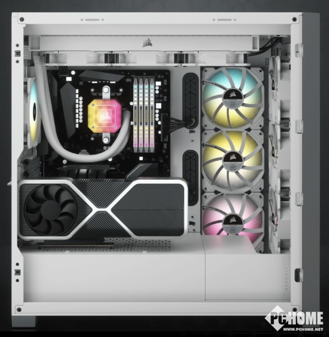 海盗船 iCUE 5000X RGB 机箱支持 iCUE 灯光同步功能,前面板同样为透明钢化玻璃,售价 204.99 美元,约合人民币 1326 元。