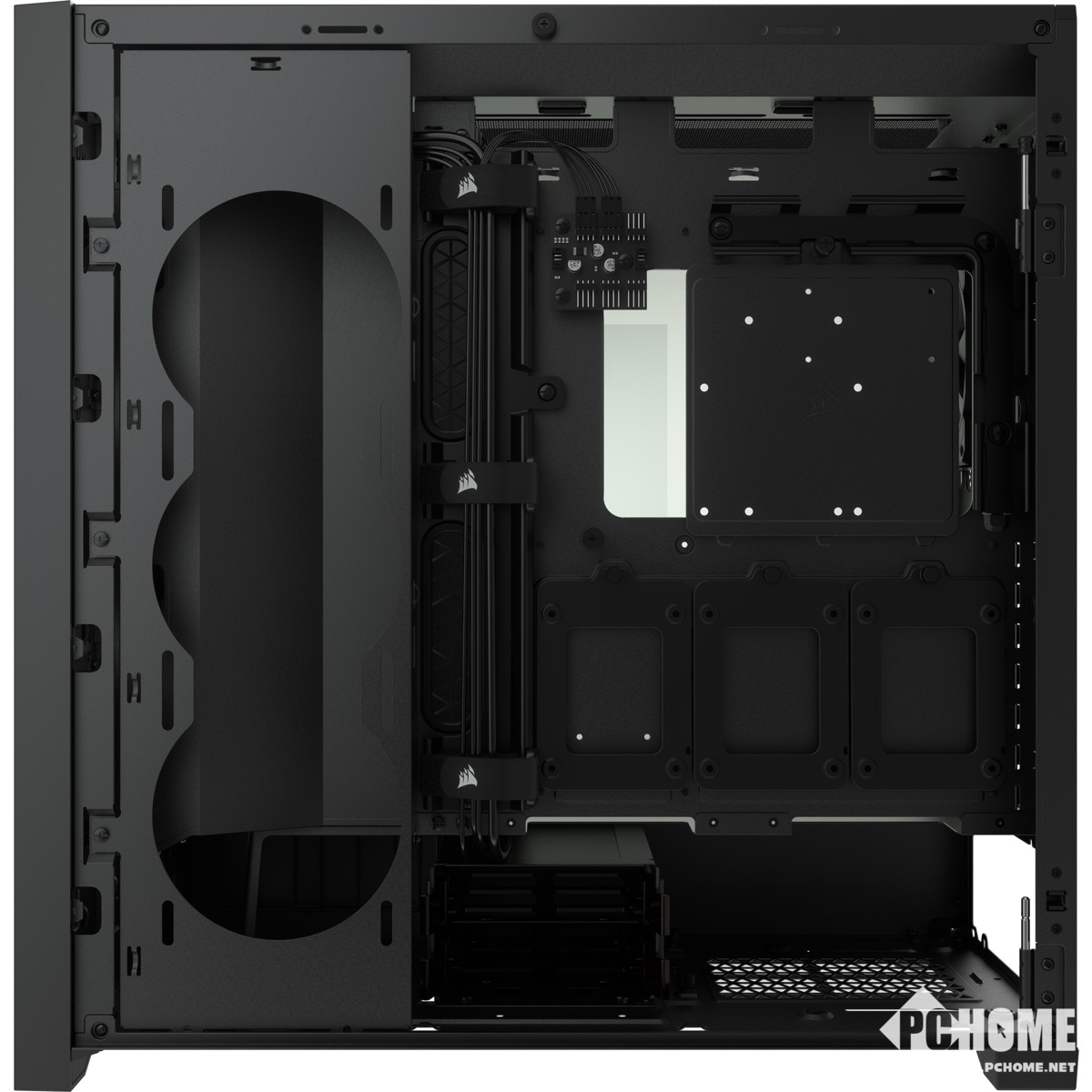 海盗船Versatile 5000系列机箱均支持最大E-ATX主板,前面板支持安装三个120mm风扇,右侧面板有着额外进风口,同样可以安装三个120mm风扇。