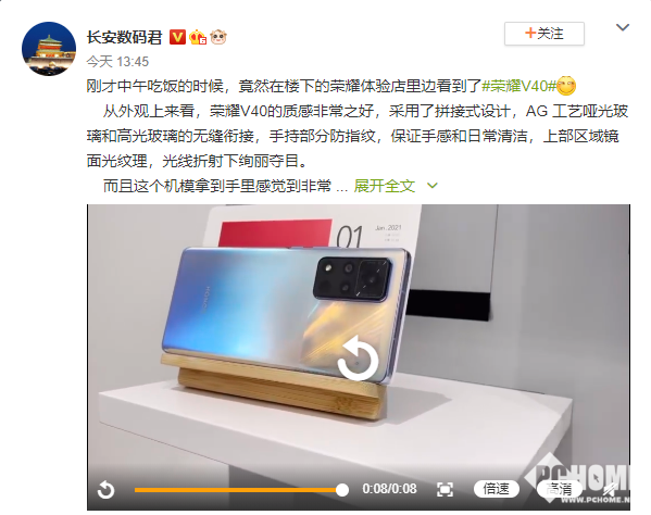 荣耀V40系列将于1月22日发布,现在这款手机的真机照曝光。今天@长安数码君曝光了荣耀V40的真机照,据之前消息,荣耀V40 5G后置三摄包括5000万像素1/1.5x的超感光主摄(ryyb)+800万像素的超广角镜头+200万像素微距镜头。