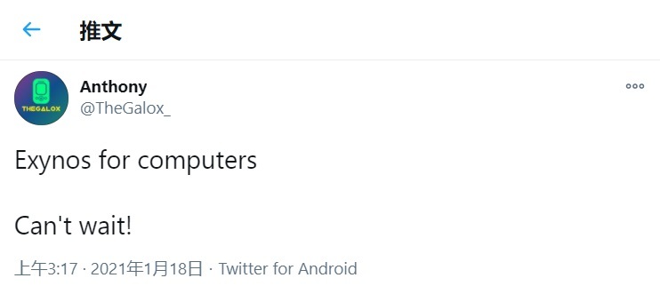 Twitter 爆料达人 The Galox 今日也发布推文,表示 “Exynos for computers”即将到来。