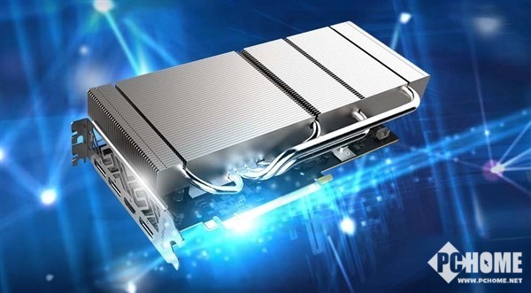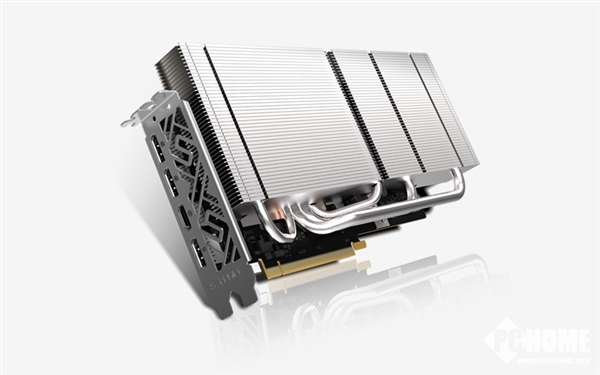 它没有使用主动风扇,而是非常密集的散热鳍片加四条热管,体积控制尚可,双插槽宽度,但是高度超出PCB本体不少。