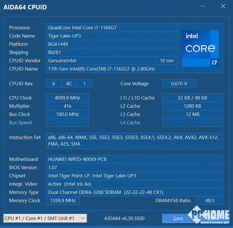 本次测试的华为MateBook 13 2021款搭载Intel酷睿™i7-1165G7,核心代号Tiger Lake,采用10nm SuperFin制程工艺,4核心8线程设计,默频2.8GHz,睿频高达4.7GHz,三级增加至12MB。同时集成了Iris 锐矩Xe显示芯片,图形性能也进一步增强。