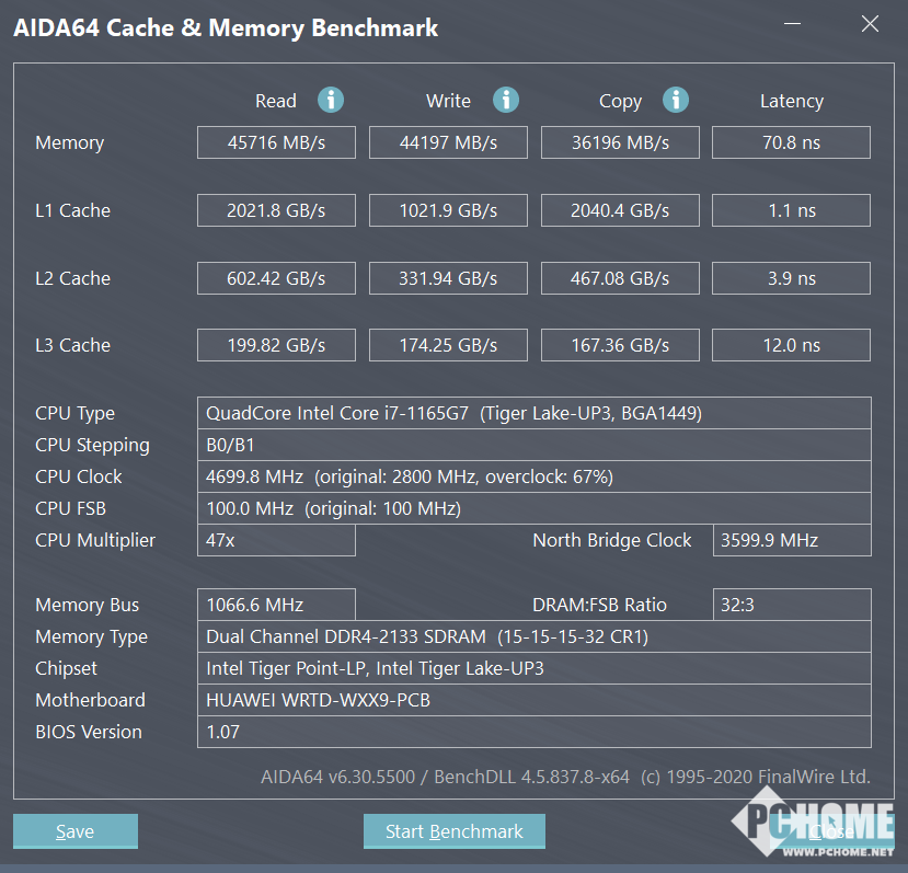 内存读写方面,华为MateBook 13 2021款配备16GB双通道 DDR4-3200MHz内存。我们通过AIDA64 Cache&Memory Benchmark进行测试,该机的内存读取、写入、复制速度分别为45716 MB/s、44197 MB/s、36196 MB/s,延迟70.8ns,读写都超过了40000MB/s大关,可以为整机带来更快的响应速度。
