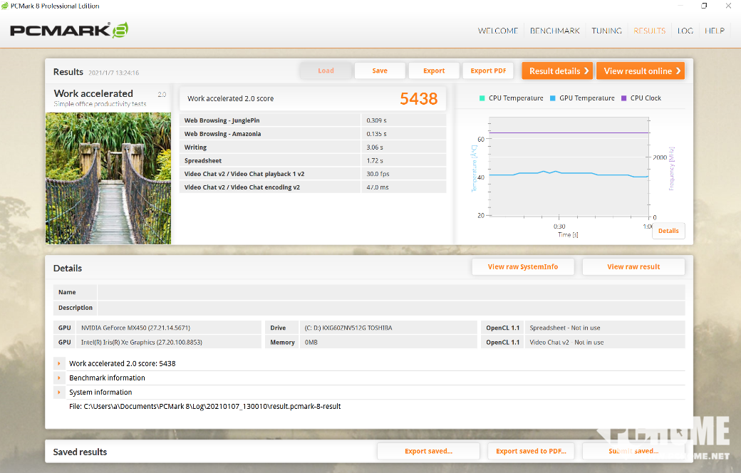 在衡量整机性能的PCMark 8测试中,华为MateBook 13 2021款在Work accelerate场景的测试中得分5438,性能非常强悍,超过5000分的成绩已经达到了专业级笔记本的水平,可以轻松满足日常使用中的办公、设计、学习以及影音、游戏娱乐需求。