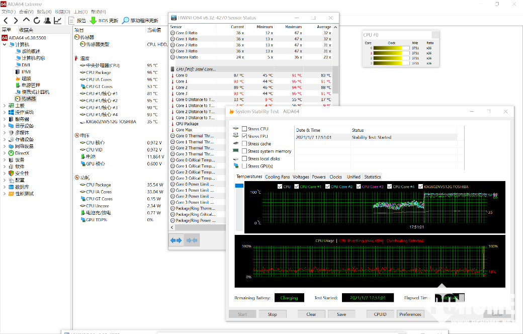 稳定性方面,我们采用AIDA64自带的系统稳定性测试来检验整机在持续满载状况下的情况,在进行一段持续时间长达15分钟的拷机测试之后,显示CPU最高温度为84°C,但由于系统设定在高能模式下,部分CPU核心的温度还是达到了90°以上,风扇噪音也有所增加,不过仍处于正常水平。