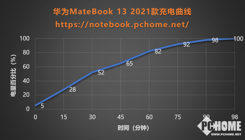 充电速度方面,华为MateBook 13 2021款标配USB Type-C接口充电器(65W)。我们使用Type-C接口进行充电实测,发现整机的充电速度还是令人满意的,前30分钟内的充电速度较快,可以从5%充到52%,一个小时内就可以充到82%,后程阶段进入涓流充电阶段,全部充满用时98分钟。快速充电可以让MateBook 13 2021款充电15分钟即可续航2小时,快速回血。