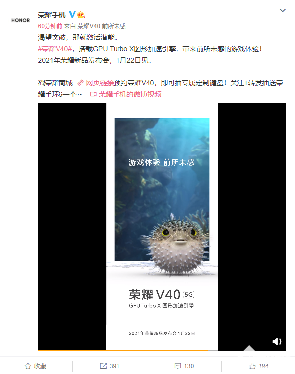 今天上午,荣耀手机官微发布最新预热视频,官宣荣耀V40将搭载GPU Turbo X图形加速引擎。同时,2021年荣耀新品发布会将于1月22日举办。